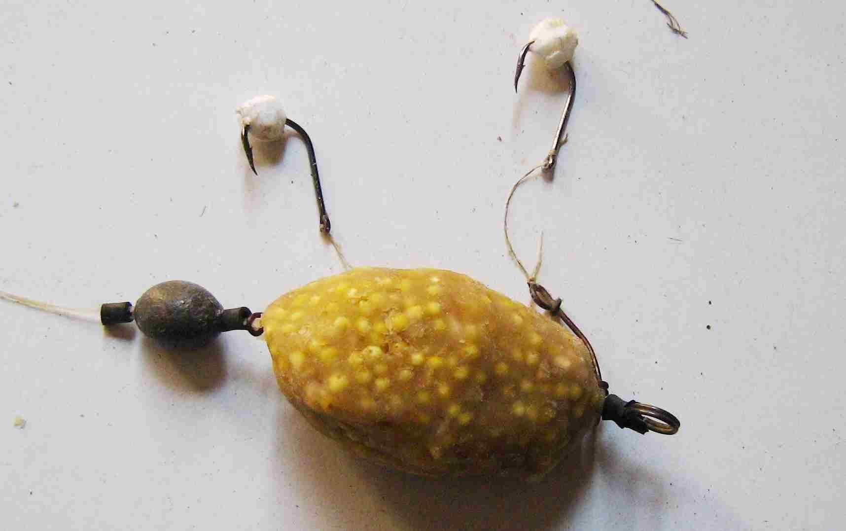 - Крючки следует располагать в прикормке не после полной набивки, а в процессе ее