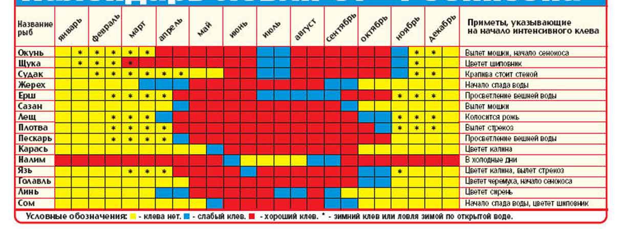 Календарь клева составляется с учетом наиболее благоприятнейших условий хищницы для вылова на каждый сезон года по месяцам. Каждый месяц года хоть в малых деталях, но имеет отличия, как по интенсивности клева, так и наличием количества благоприятных дней.