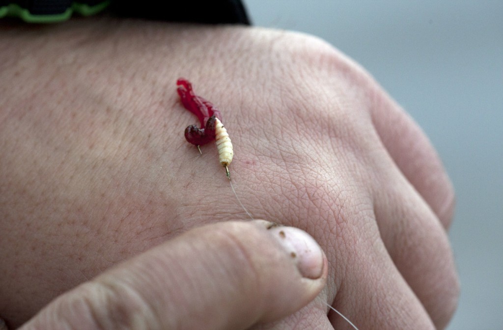 Как говорилось ранее, рыбу больше всего привлекает живая и активная наживка. Поэтому насаживать личинки следует аккуратно.