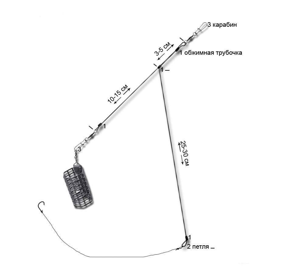 Эта оснастка отличается тем, что кормушка глухо прикреплена к концу основной лески. Скользящий поводок находится выше места крепления кормушки. Расстояние между поводком и кормушкой составляет 5 – 20 сантиметров.